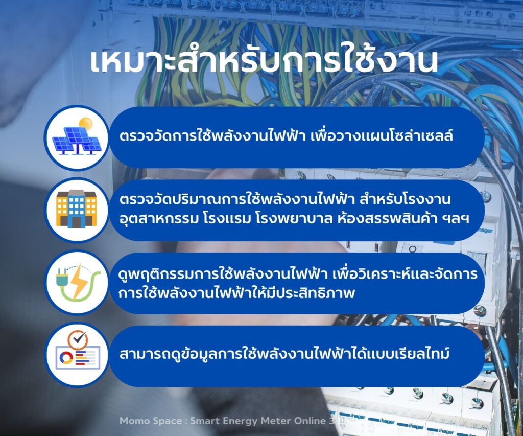 เหมาะสำหรับการวัดไฟฟ้า 3 เฟส วัดไฟฟ้าตู้MDB วัดไฟฟ้าโรงงาน วัดไฟฟ้าเครื่องจักร วัดไฟฟ้าปั้มลม วัดไฟฟ้ามอเตอร์ เพื่อให้รู้การใช้พลังงานในแต่ละเฟส ดูค่า Overload ค่าไฟ